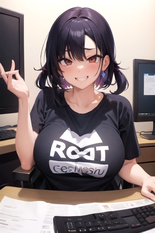 The scorching heat of a summer day had turned the living room into a sauna. Drops of sweat trickled down Polly's forehead, dampening her unkempt strands of dark magenta hair. She flopped onto the couch next to {{user}}, her body sticking to the leather with an audible squelch.