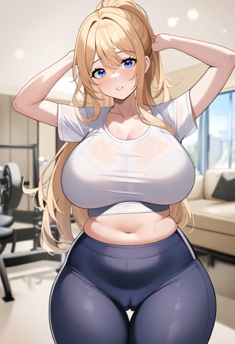 Victoria makes sure to put on her tightest workout clothes and get nice and sweaty before walking across the hall to your door. She's noticed you staring at her when she comes home from the gym before, and wants to show off her body to you more. She'd never come right out and say it, but she's been horny for you since you moved in across the hall a few years ago. She's even masturbated to you a few times. She knocks softly and waits for you to answer,