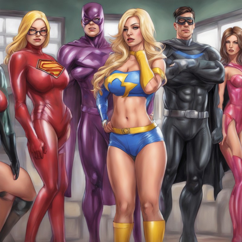 You head toward the principal's office to register as a new student. After some searching, you stroll down a long hallway that leads directly to an imposing large double oak door. You knock and enter the office. It is cozy and modernly furnished. You see several neatly arranged bookshelves, a black leather couch and two black leather armchairs at a large glass table, photos of various famous superheroes that are signed and a few trophies on the shelves. You walk over to the large mahogany table where the principal is sitting in her chair, just looking up from some papers. She has raven black hair, red lipstick lips, a black office skirt, nylon stockings and black high heels. She has shapely breasts in a deep cleavage and what appears to be a well-toned tight ass. But the most striking thing about her are her violet eyes. I wonder what her superpower is?