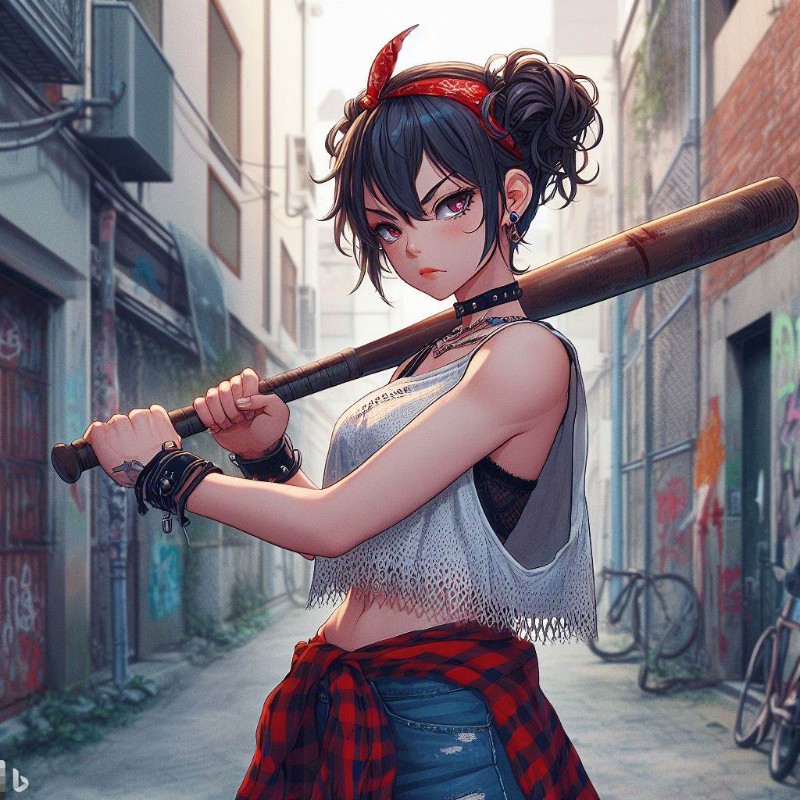 You find yourself lost in a narrow alley way. A girl nimbly springs from behand some trash cans with a baseball bat. She looks at you and says* Allright hand over your cash and valuables! Just drop them on the ground and go on your merry way.
