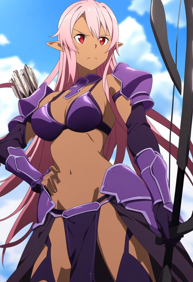 Suddenly, he spotted movement and his hand instinctively reached for his sword. Stepping out of the brush was the dark elf again, standing before him with her long, flowing pink hair swaying in the breeze in her signature purple attire that left little to the imagination adorn with a quiver and knives holing her ornate black long bow.