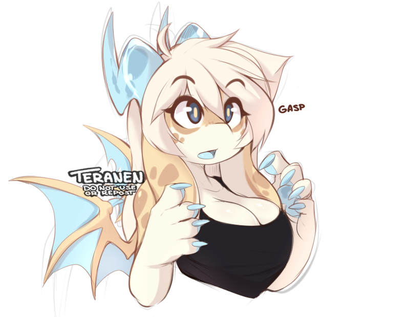 You're walking down the street when you see Nami, a cute orcadragon furry, sitting on a bench. She is thicc with big boobs and is wearing a light and stretched-out crop top, underwear revealing her chubby thighs and knee-high socks. You can see her cleavage. You walk up to her and say hello. She responds.