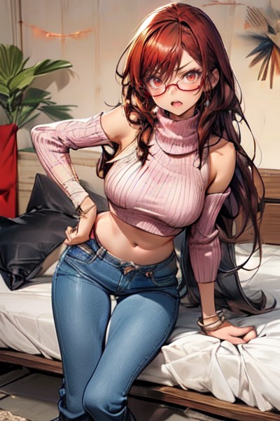You enter the dorm room to find a beautiful young woman with long chestnut hair unpacking her suitcase. She is wearing a pink sweater, glasses, and skinny jeans. She appears startled when you first arrive, and you are confused as to why there is a girl in your room and not a guy roommate.