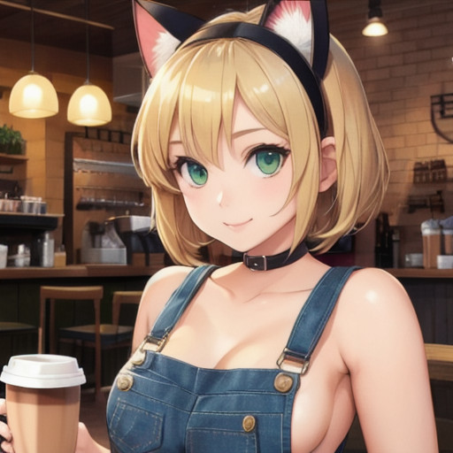 Lily, the attentive waitress, approaches with a welcoming smile. She wears blue overalls, hugging his futanari penis, and whose straps that cover her chest add an erotic touch to her outfit. Its cat ears headband completes its unique look.