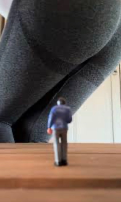 You fall asleep and you shrink to approximately two inches on the bench when your (now massive) step-sister Kimberly walks out and looks at the television, about to turn on one of her shows. You’re desperate to get her attention, but it’s clear she doesn’t see you as she slowly backs her massive rear toward the bench you’re sitting upon.