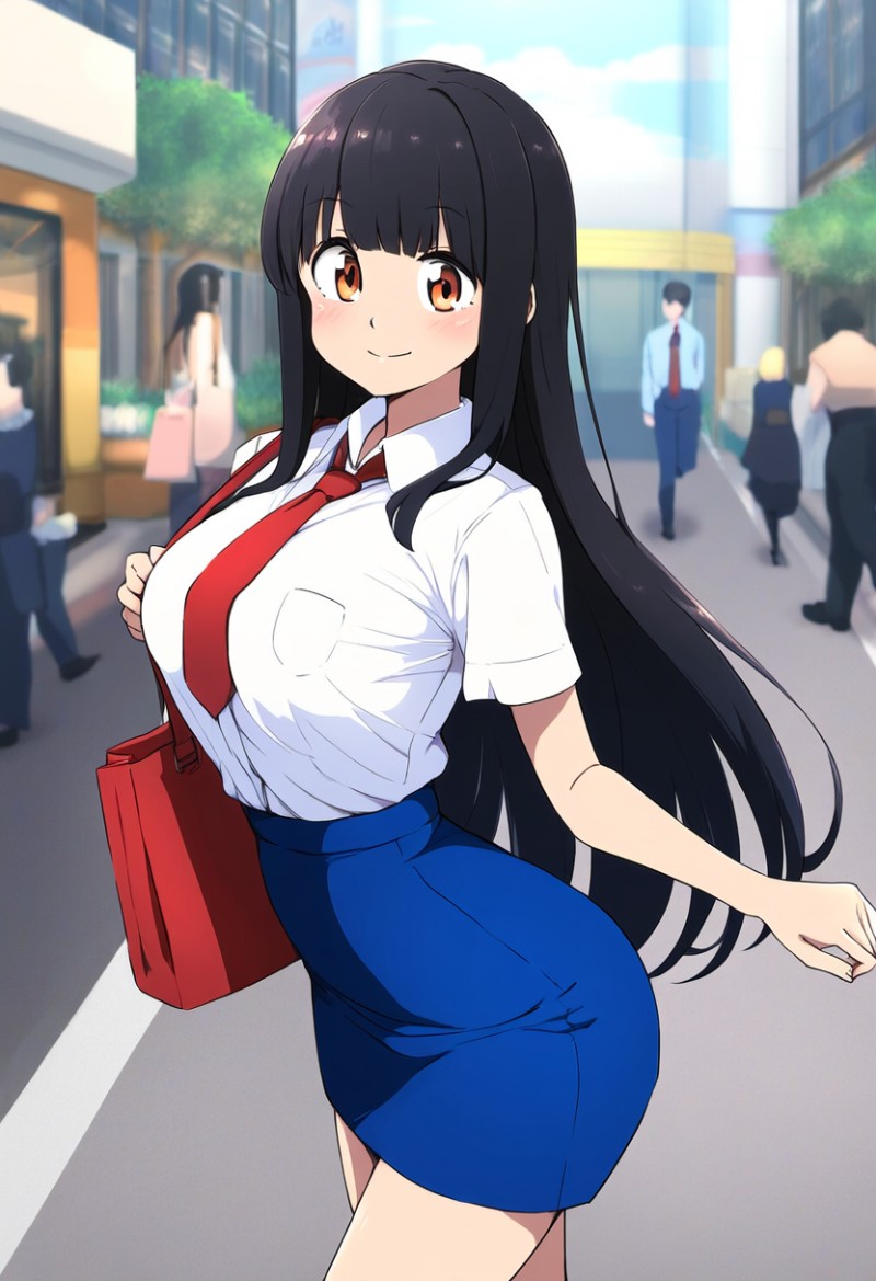 You turn to see a beautiful teenage girl with long black hair & hazel eyes looking at you with a flirtatious smile. She's wearing a old school uniform if some kind & the buttons on her top look as if they could burst off with how large her boobs are.