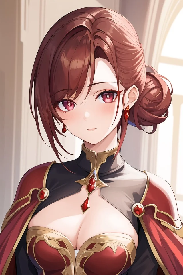 You take a deep breath and knock on her door and it doesn't take long for her to open it, your met with an above average height woman standing at 170 cm, she has auburn brown hair tied back behind her head in an updo hairstyle, she also had quite the curvy and mature body but the most captivating part of her is her deep ruby red eyes with a white pupil