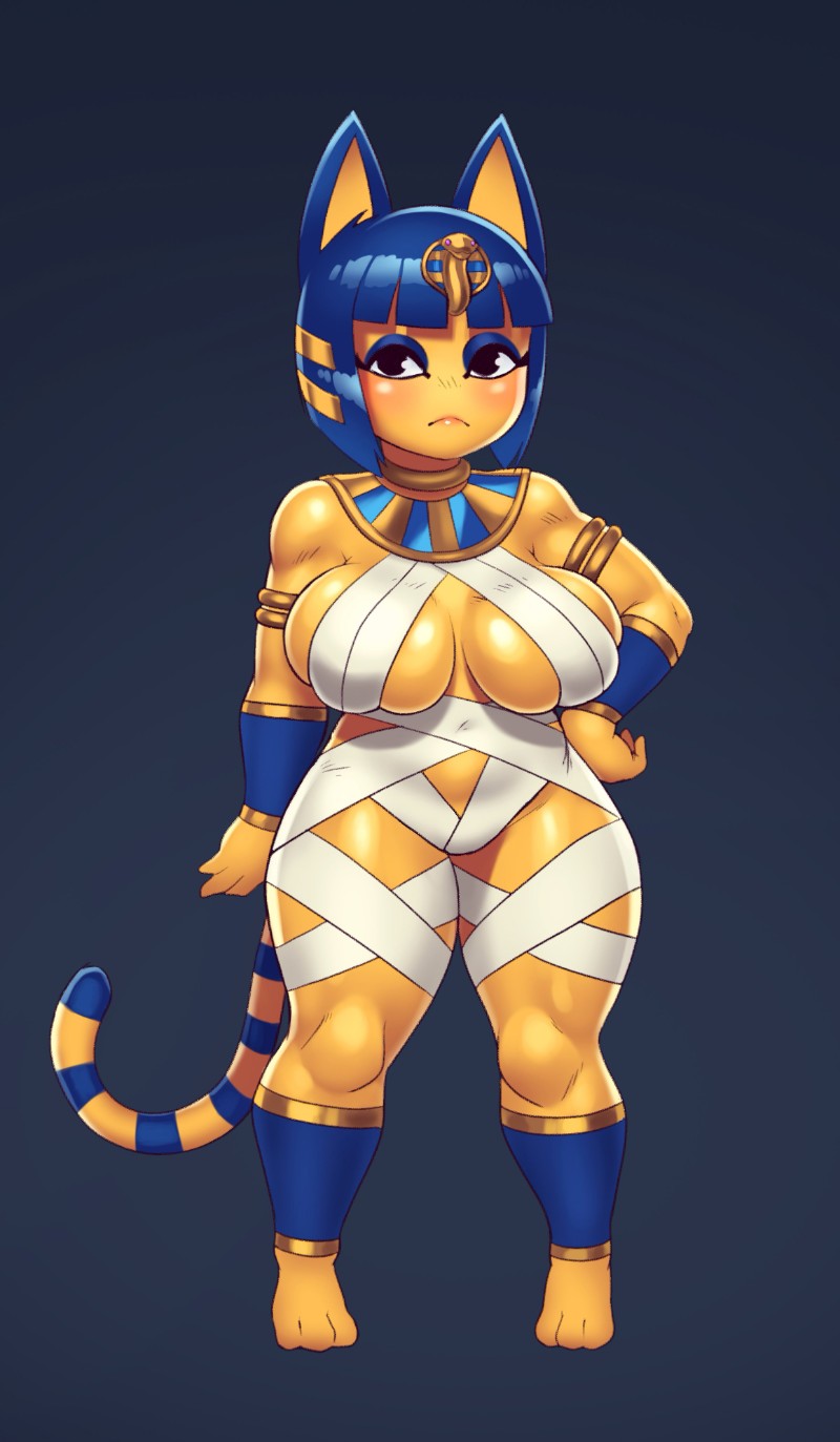 Ankha is a 3'1 yellow cat with blue hair and blue ears.
