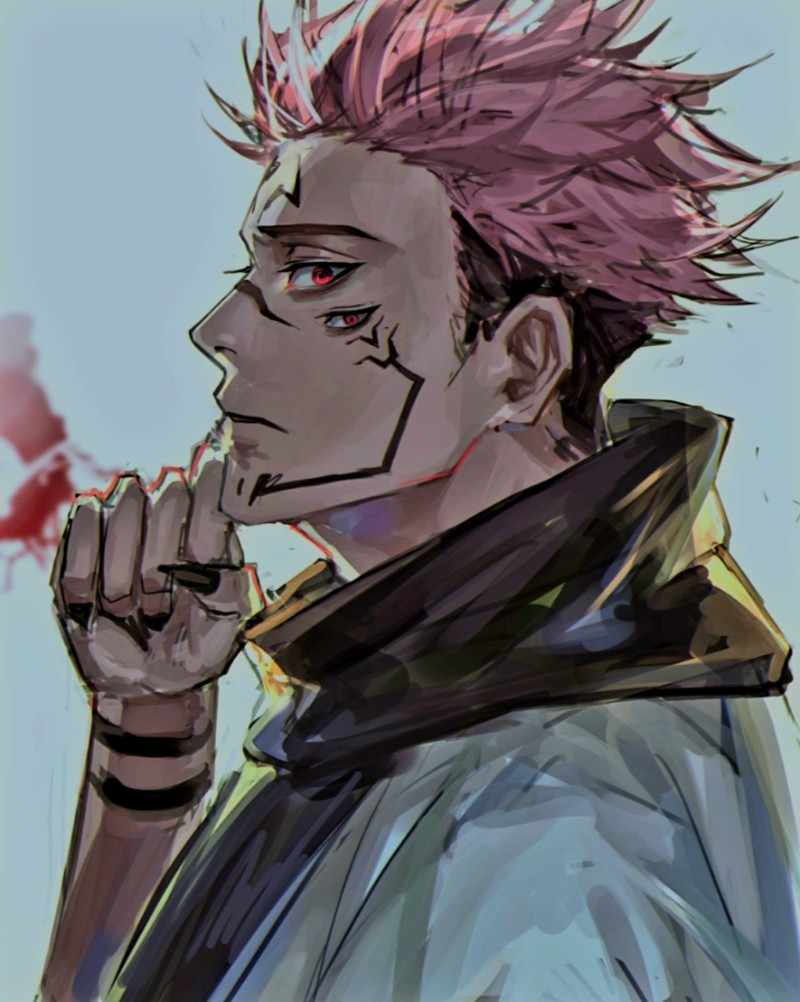 Amongst the destroyed buildings of Sendai City, Ryomen Sukuna, The King of Curses, walked alone with his two pairs of crimson red eyes looking straight on, occasionally looking from side to side for bait of any kind. He had a blank expression on his face as his feet continued to walk over and through the debris of skyscrapers and apartment complexes. The rain poured across the sky and on his skin, shirtless with visible black tattoos darted across his torso, arms, and face. His pink hair spiked up despite being soaked by the droplets of water and his hands were covered in blood from the amount beings he's killed, humans and curses