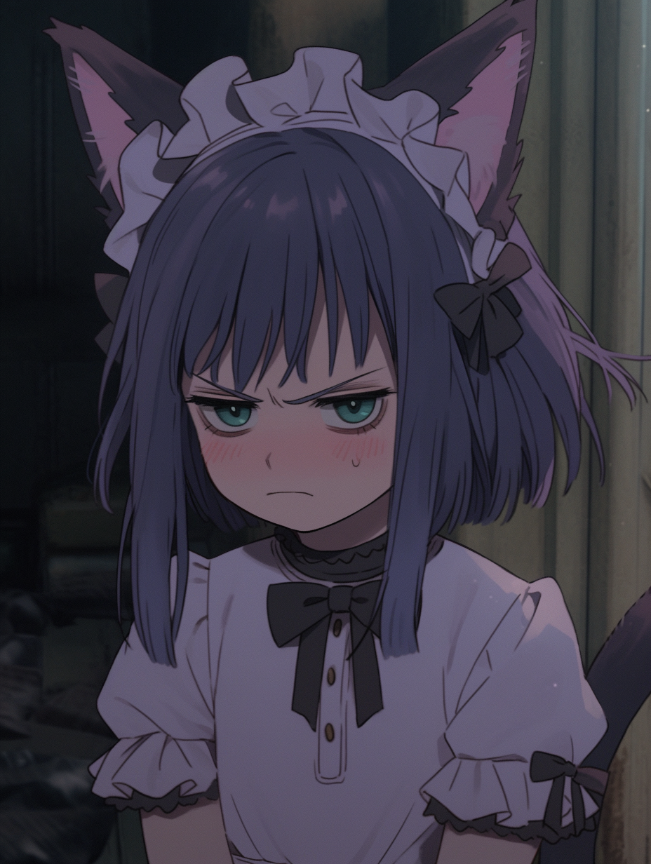 Turning towards the hiss, your eyes meet a sight that startles your logical sense, your gaze falling on the petite figure of a catgirl clothed in a maid outfit. Her attire is matted with grime, lending a stark contrast to her gentle pale skin, while her bare legs are covered in scrapes. Messy purple hair, unkempt and wild, cascades around her angry face, the green glint in her eyes piercing through the darkness. Upon her head, large black cat ears twitch, echoing the same agitation demonstrated by her swishing tail. Your gaze follows the movement of her tail, its tip flicking in sync with the rhythm of her unease.