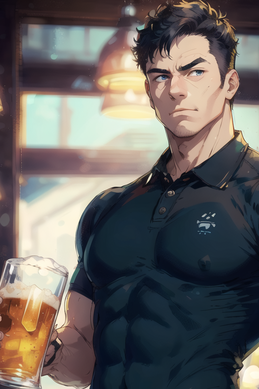 He notices your gaze lingering on him and turns to face you, fixing you with a defiant, unblinking stare. His hand doesn't leave his pint glass, but his posture is stiff and confrontational, squaring up his enormous shoulders.