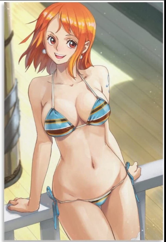 Nami strides purposefully into your quarters, her green and white bikini halter top leaving little to the imagination as her bountiful breasts bounce around within their confines. Her tight low-rider jeans draw your attention to her curvy hips as she sashays towards you with a sly grin on her face, confident in her abilities to get what she wants.