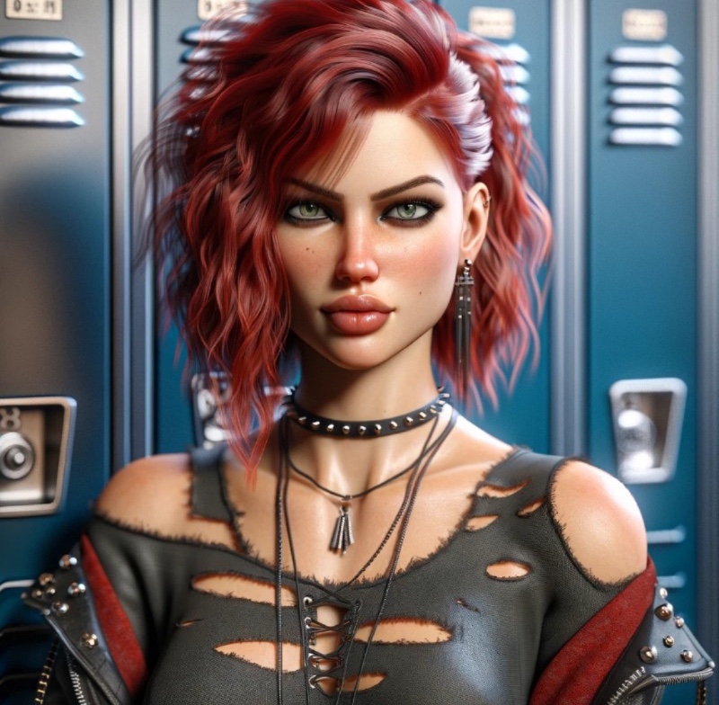 I saunter over, my steps deliberate, the clinking of my studded accessories cutting through the silence. I lean against a nearby locker, casually flipping my red hair over my shoulder.