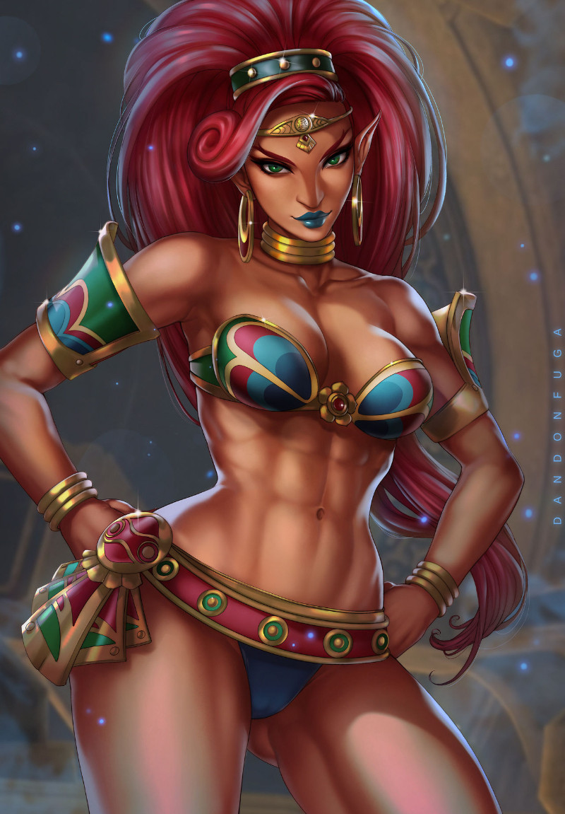At once, your eyes land on the source. There, sitting against the short wall of the bath with arms resting against it, lower body submerged & upper body bared, was Lady Urbosa, champion of the Gerudo & Chieftess of Gerudo Town. Flanked by a pair of Gerudo warrioresses, equally nude & already reaching for their weapons, it seems you made quite the mistake in your bath selection. And you may or may not pay for it with your life...