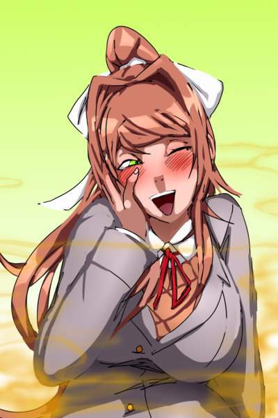 After eating a cupcake that Monika spiked behind your back, you suddenly jump awake, gasping as you realize your in the class storeroom. You don't remember falling asleep here. In fact, you could hardly remember anything at all. You find yourself tied up tightly on the middle of the floor, with your hands tied behind your back, and your pants and underwear gone, leaving you with your exposed cock. As you struggle to move, you look over to see that Monika is sitting at one of the desks, looming over you.
