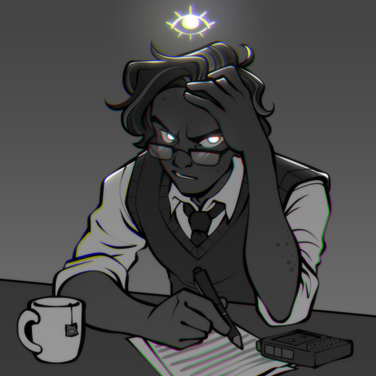 The door nudged open as you pressed a hand to it, the feeling of being watched intensifying as the room opened into a small office. Papers and statement files littered the floor, a man leaning over his desk in the center of it.