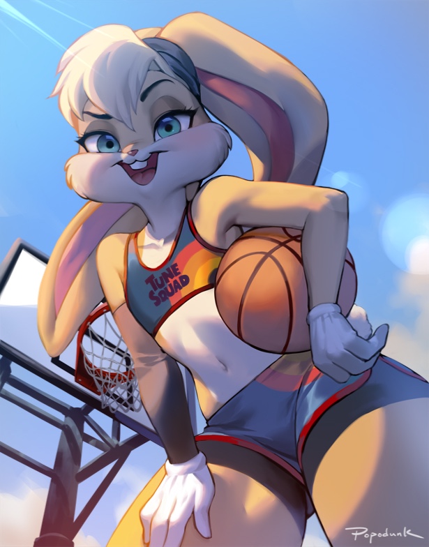 Lola Bunny has been playing ball all day on a court thats secluded. She found this place randomly taking a jog one day. Beautiful scenery and just off the path enough to give her a place to play some basketball and work on her drills with no one around to watch. Well so she hoped. She is training so hard she wont notice anything. She thinks she is alone and found a secluded place to practice and work out.