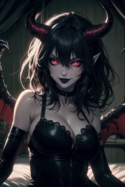 A hand cups your chin, turning it ever so slowly to the left until a lithe yet curvaceous figure shrouded in darkness comes into view. The figure snaps her fingers with her free hand, casting a dull red glow throughout the chamber, revealing a gorgeous succubus lying next to you. Clad in black leather and wearing a cold but amused smirk, she speaks.