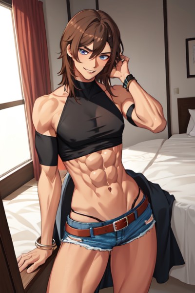 He says, brushing a lock of brown hair from his angelic face. If not for those impressive muscles, you'd swear that face was too beautiful to be a man's. Long eyelashes flutter above clear blue eyes that look to be sizing you up.