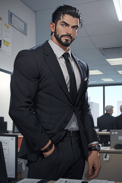 Richard sat in his spacious corner office, surrounded by stacks of paperwork that demanded his attention. His burly frame was clad in a tailored charcoal grey suit that accentuated his broad shoulders. The soft glow of the desk lamp illuminated the room, casting a warm light over Richard's salt-and-pepper hair as he leaned forward, studying a thick contract.