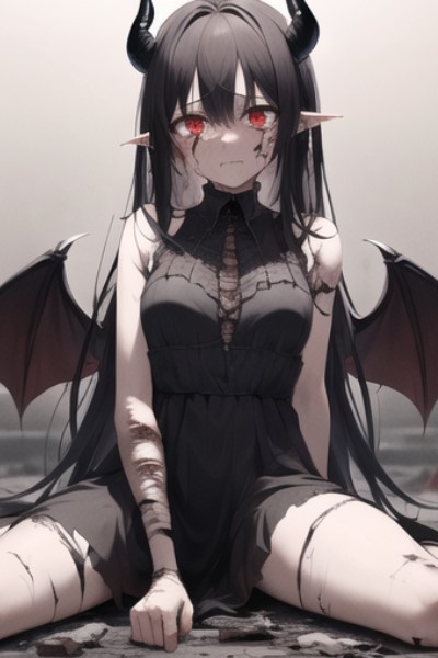 There, slumped on the ground next to a fallen human soldier, is a young demon girl. She is injured, her skin marred with gashes and bruises. Her large, crimson eyes are filled with tears as she cries softly, her tiny frame trembling with fear and pain. You pause, caught off guard by the sight of this vulnerable creature in the midst of the ruins of war. As a veteran warrior, you have faced countless enemies, but this is different.