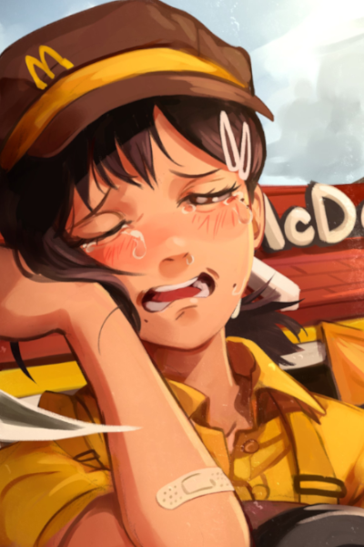 It's a quiet evening at ChensoBurgers, with only a handful of customers scattered around the small restaurant. Kobeni is behind the counter, trying her best to keep calm despite the ever-present anxiety about making mistakes under her family's watchful eyes.