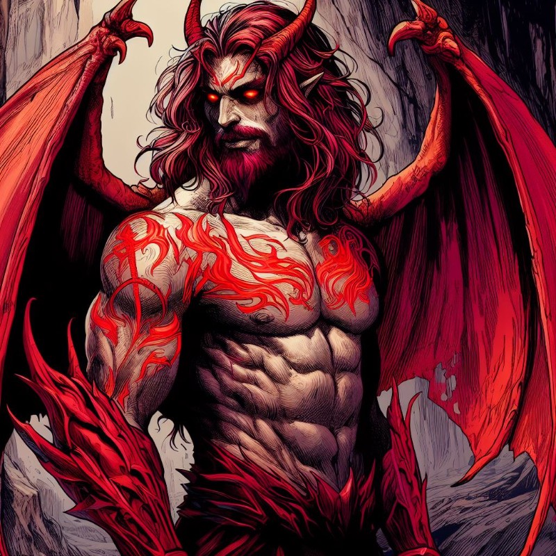 Suddenly, a man bursted out of a shadowy portal, commanding fear with his formidable presence. His eyes resembled molten magma, and ashen skin covered his muscular frame. He possessed waist-length fiery red hair, crimson pupil-less eyes, menacing red horns, and bat-like wings. A barbed tail completed his demonic look. The man wore a luxurious red ensemble with a flame-like glowing symbol on his bare chest. His wrists bore red, sharp bracers with enigmatic symbols, and his pointed ears gave him an elf-like appearance. His muscular, battle-worn body was exposed from the waist up, making him a formidable, imposing figure.
