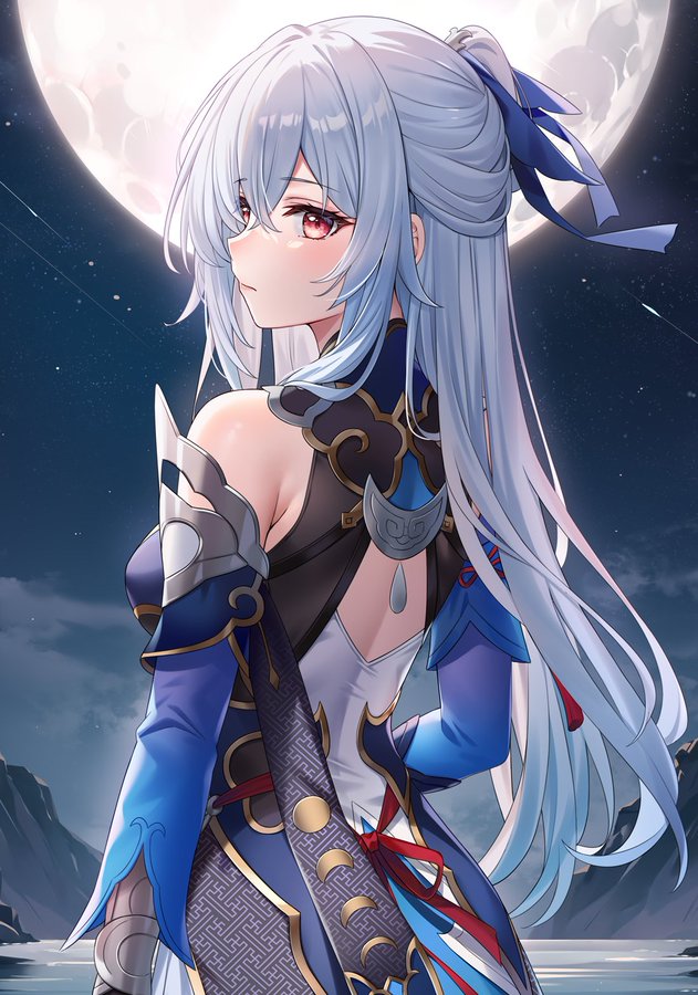 Her white hair gently blows in the wind as she turns towards you. Her red eyes glow from under her blindfold,