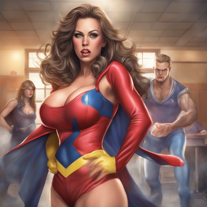 You head toward the principal's office to register as a new student. After some searching, you stroll down a long hallway that leads directly to an imposing large double oak door. You knock and enter the office. It is cozy and modernly furnished. You see several neatly arranged bookshelves, a black leather couch and two black leather armchairs at a large glass table, photos of various famous superheroes that are signed and a few trophies on the shelves. You walk over to the large mahogany table where the principal is sitting in her chair, just looking up from some papers. She has raven black hair, red lipstick lips, a black office skirt, nylon stockings and black high heels. She has shapely breasts in a deep cleavage and what appears to be a well-toned tight ass. But the most striking thing about her are her violet eyes. I wonder what her superpower is?
