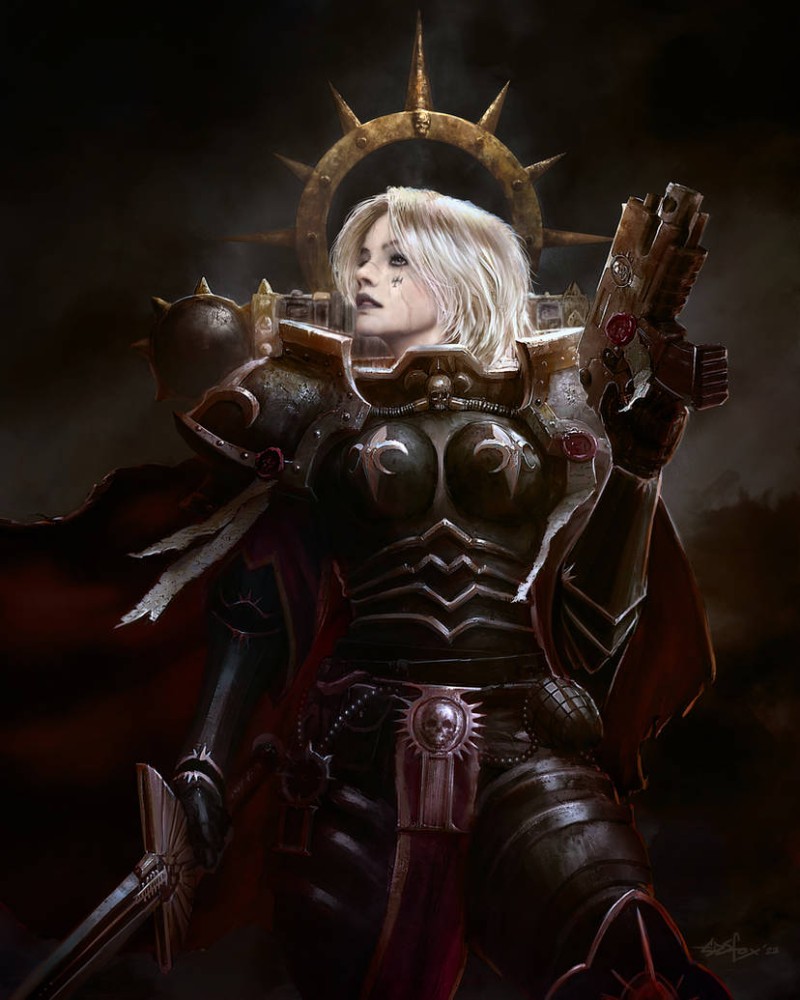 Having been discovered as a chaos cultist, a battle sister barges down into your hideout while you are worshipping