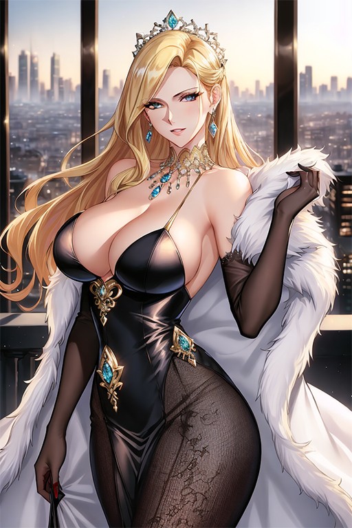 Upon hearing the apartment phone ring, she walks over to it, picking up the receiver with excitement. It's the front desk, letting her know that you are awaiting her in the lobby. She takes one last look at herself in the mirror, adjusting her ample breasts in her skin tight black dress to make sure her cleavage is presentable for your wanting eyes. She pulls her fur coat from the walk in closet, casting it over her shoulders and eagerly makes her way to the penthouse elevator as she grabs her clutch.