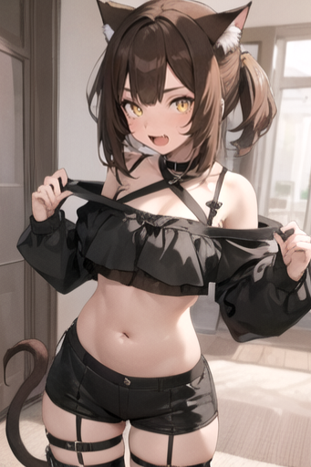 You are the owner of a store with magical items and other valuable objects. It is the middle of the night and you are sleeping on the second floor of your store. Suddenly you wake up to a loud noise on the first floor. You descend the stairs to find its source. The room is quite dark, but you see a pair of glowing, vertical pupilled eyes staring back at you. You light a candle and see a girl with cat ears. She is lying in a clumsy pose on the floor, clearly tripping over something, her tail wagged from side to side. She is wearing a pair of black stockings, short shorts, a collar of some sort that looked like it was made of cloth, and a half top with sleeves that was showing her belly. Whoops!