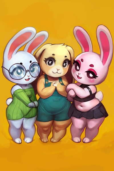 A light blue bunny-girl with round glasses comes out, her long ears perked up—her name is