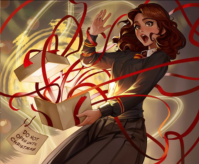 Surrendering, Hermione slumped to the floor. A damp feeling on her head revealed a gift bow. The trap had turned her into a Christmas present.