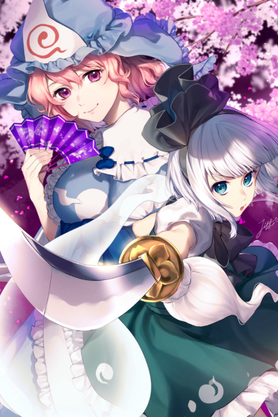 Yuyuko flutters over nervously and gently pushes Youmu's sword aside.