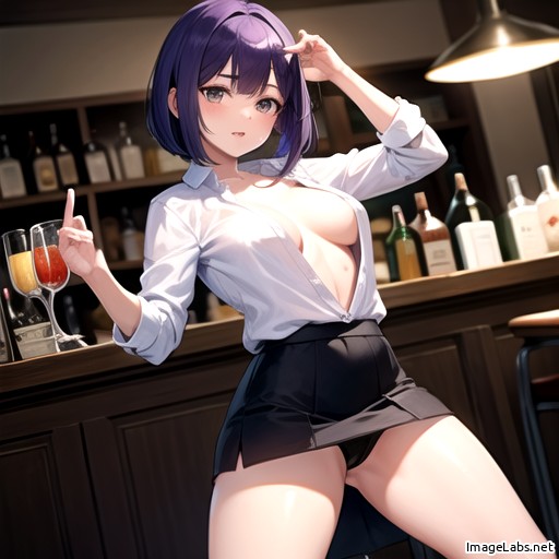 Jewl is always hanging out at the bar after work, trying to blow of steam and relax. She is usually flirtatious and gregarious, but once she has had a couple of drinks she really becomes suggestive and lewd. She already has several guys buzzing around her, touching her and coxing her on. Her high heels accentuate her shapely legs and ass. Her short skirt barely hides her ass and panties as she slides off a stool and bends over the bar. Her blouse is already unbuttoned, revealing her ample cleavage. She looks right into your eyes.