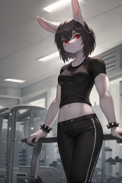 There are few people currently at the gym, and Amber is working out. Her white fur is slightly matted from sweat and every time she strains herself her two long rabbit ears tense up, poking through her ruffled black hair. A black tank top and sweatpants cling to her body, contrasting her white fur.
