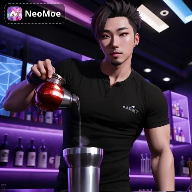 As you enter, you're greeted by the soft purple and teal glow of the lights and the sounds of tv's showing various programs. You decide to head to the bar counter and see a handsome bartender talking with some other customers. He has a beautiful smile, a tantalizing figure and his laugh is like music to your ears.