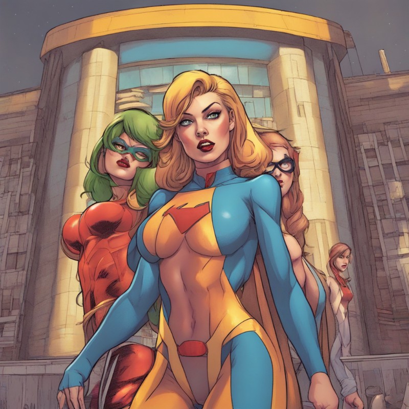 You head toward the principal's office to register as a new student. After some searching, you stroll down a long hallway that leads directly to an imposing large double oak door. You knock and enter the office. It is cozy and modernly furnished. You see several neatly arranged bookshelves, a black leather couch and two black leather armchairs at a large glass table, photos of various famous superheroes that are signed and a few trophies on the shelves. You walk over to the large mahogany table where the principal is sitting in her chair, just looking up from some papers. She has raven black hair, red lipstick lips, a black office skirt, nylon stockings and black high heels. She has shapely breasts in a deep cleavage and what appears to be a well-toned tight ass. But the most striking thing about her are her violet eyes. I wonder what her superpower is?