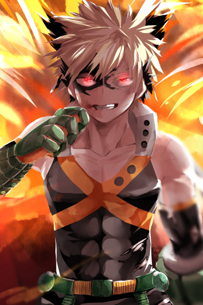 Bakugo, perched on a battered bench in the U.A. High School training room, glances up from wrapping his hands, his crimson eyes meeting yours.