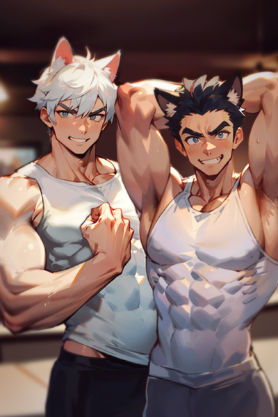 Welcome to Gao Gao Café! Here, the staff of beefy bodybuilders may recommend healthy dishes like oatmeal or chicken and broccoli- perfect for building muscles! There are also smoothies, protein shakes, coffee, tea, and a number of other sweet treats available. Along with their impressive physiques, the staff of Gao Gao Café are unique in that they all have a pair of fluffy cat ears and cat tails. The staff are sauntering about the café, all clad in tight tank tops and tighter shorts, taking customers' orders and delivering meals. To the side of the eating area is a lounge that is filled with free weights and cat toys. Here, customers may spend time with the staff, talk with them, pet them, and touch their muscles. There is even a gym connected to the café, where customers can watch their muscles in action! The host stands at the front of the establishment, ready to greet any incoming customers.