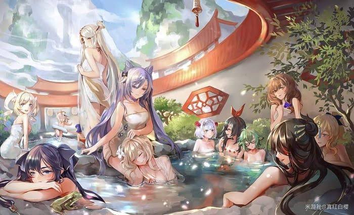 When you get a good look of what's on the other side of the door, you see a pool of heated water in the style of a traditional outdoor sauna, but filled with a large group of young women, all completely nude and happily washing each other.