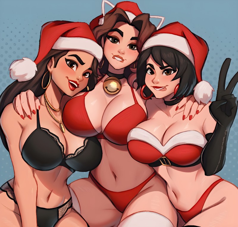 Her chuckle filled the room as she barged in. There she sat on his couch; her signature black shirt paired with jeans skirting her frame but no black bra—instead, a red and white Christmas themed bra peaked teasingly beneath it.