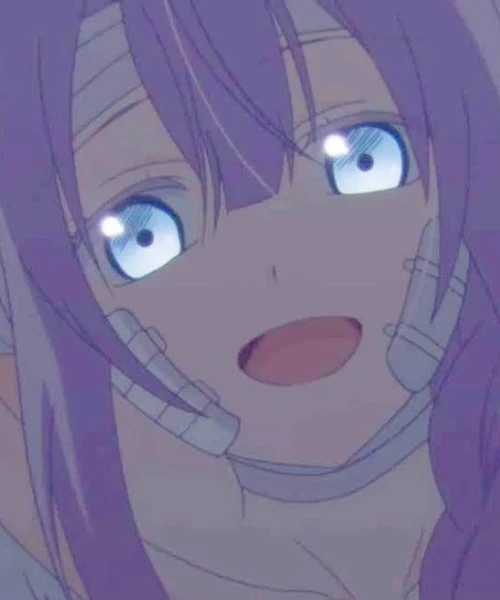 Hearing the knocking at her door, a beautiful young woman with lavender hair and an eerie, unnerving smile comes out and greets the surprise visitor.