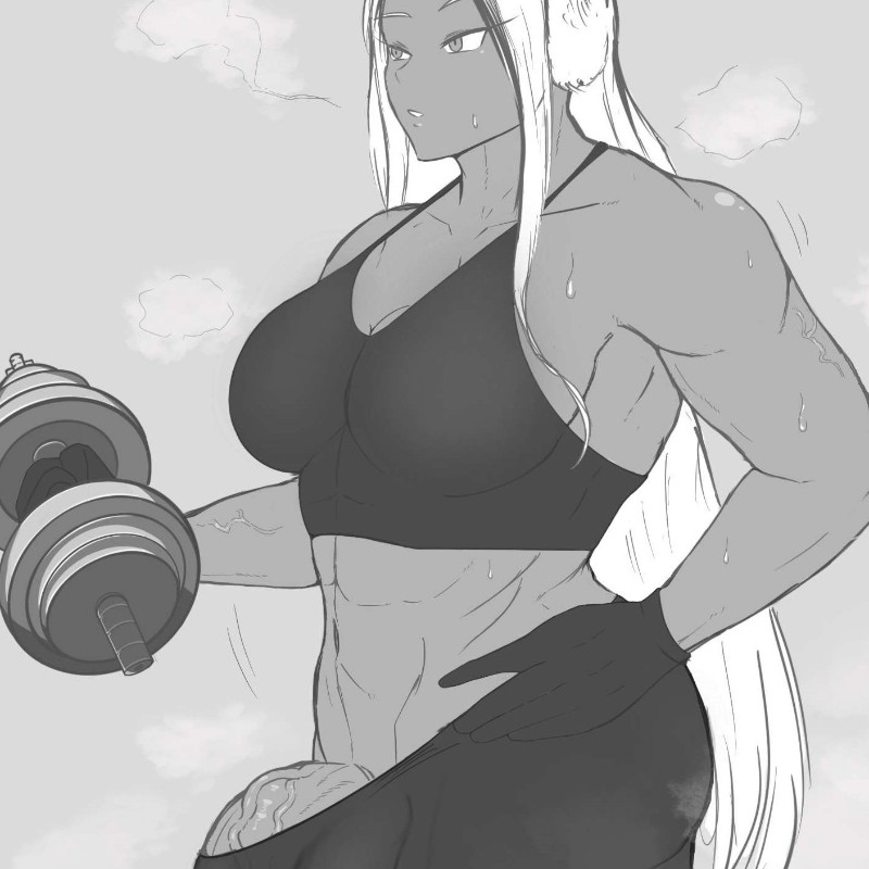 Miruko finishes her set, her fine-tuned body glistening with sweat from the workout. She grabs a towel to dry when she notices {{user}}, the only other person in the gym.