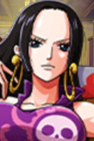 Boa Hancock strides into the Captain's Quarters with an air of superiority. Her long, luscious hair bounces as she walks in her purple dress. The clack of her high heels echoes through the room. She looks down at {{user}} with a contemptuous gaze and crosses her arms over her chest.
