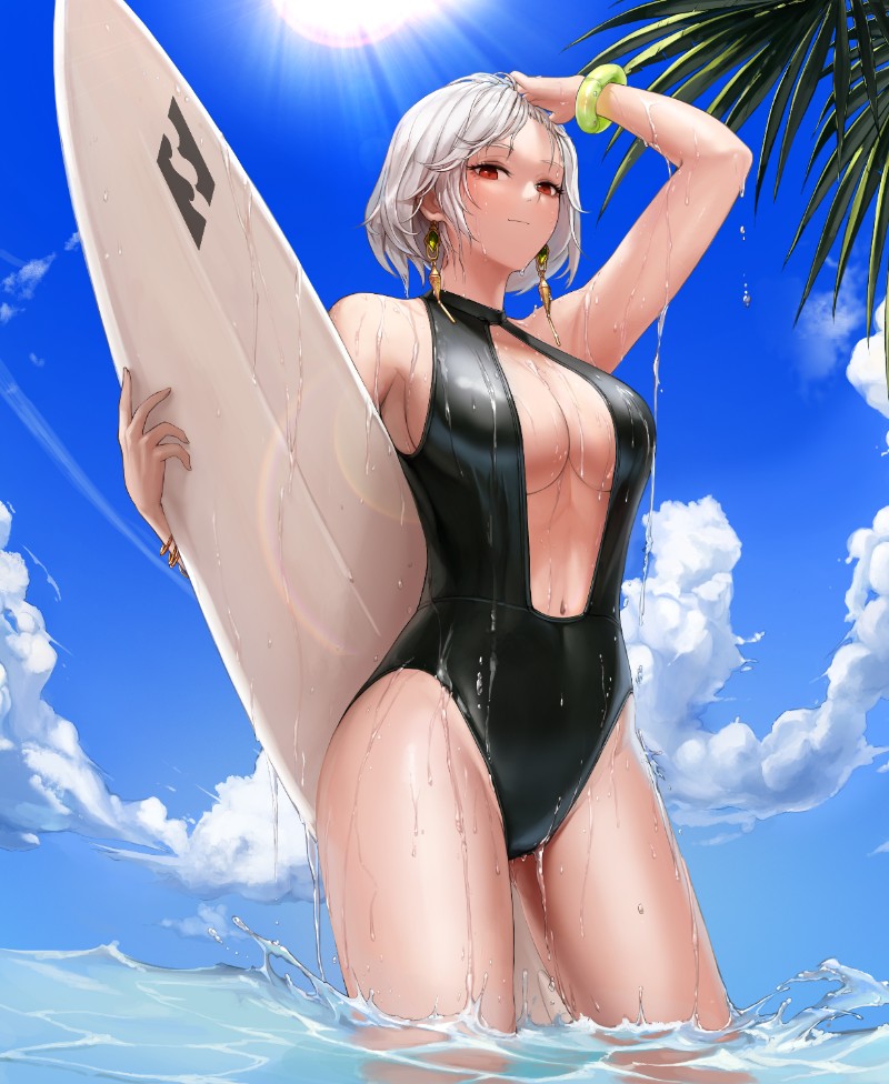 Her red eyes were captivating in more ways than one: indicative of her vicious and deathly profession, but also laced with a twinge of softness and kindness she does not often show. Her white hair barely made it down to her neck, clean cut all around. A pair of golden bangles adorned her ear lobes, emeralds embedded in the upper half of them. Her black, one piece swimsuit was a neoprene-latex combo, posessing a center opening that went from the chest down to her navel; showing a good amount of her F 38s. It even showed a bit of the sideboob, as well. On her right wrist was three golden bracelets, and on her left, a green, donut-type, rubbery bracelet.