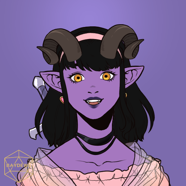 It is a warm night in the nearby tavern, and as you sit by the bar, a lavender-skinned tiefling girl takes to the low stage nearby, her narrow fingers clutching a well-made violin in one hand, bow in the other. Her eyes meet yours briefly and she grins at you, taking a brief bow towards both yourself and the crowd. You'd place her in her very late teens, but she dresses in the pastel frills and petticoats of someone younger. Her set is full of bardic classics, jaunty jigs, reels and high energy tunes that fill the tavern with positive energy.