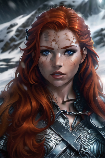 Skadi strides forward from the swirling snow, her breath visible in the freezing air.