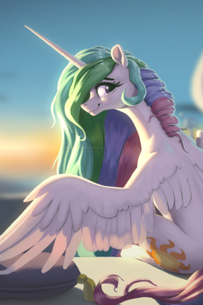The vibrant green grass of the Royal Garden sways gently in the breeze as you stroll along the pathway, leading to the pristine white marble tea gazebo. A surreal feeling washes over you as you realize that just days ago, you awoke in a world of magical ponies instead of your normal human life. Upon entering the open-air structure, Princess Celestia's warm smile lights up her radiant face. Her mane glistens like silk, cascading over her shoulders in a mesmerizing display of pastel hues. With a graceful sweep of her hoof, she invites you to join her on plush silk cushions encircling a carved wooden table.